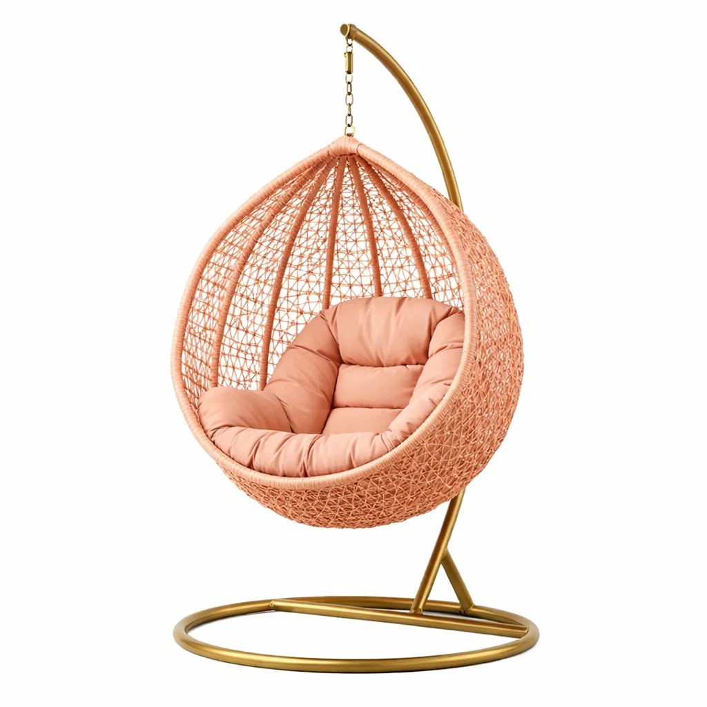Fauteuil œuf suspendu en rotin avec coussin en polyester rose et structure en métal doré