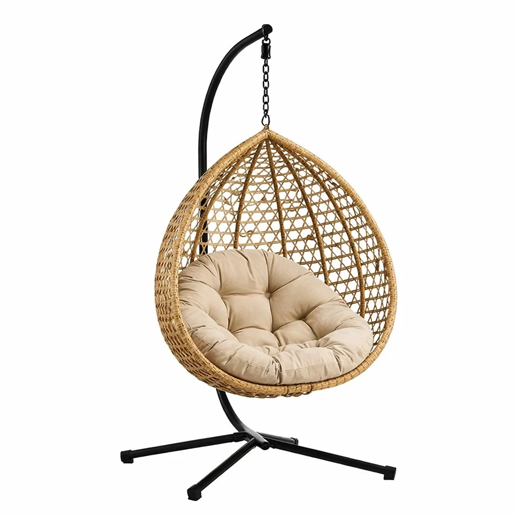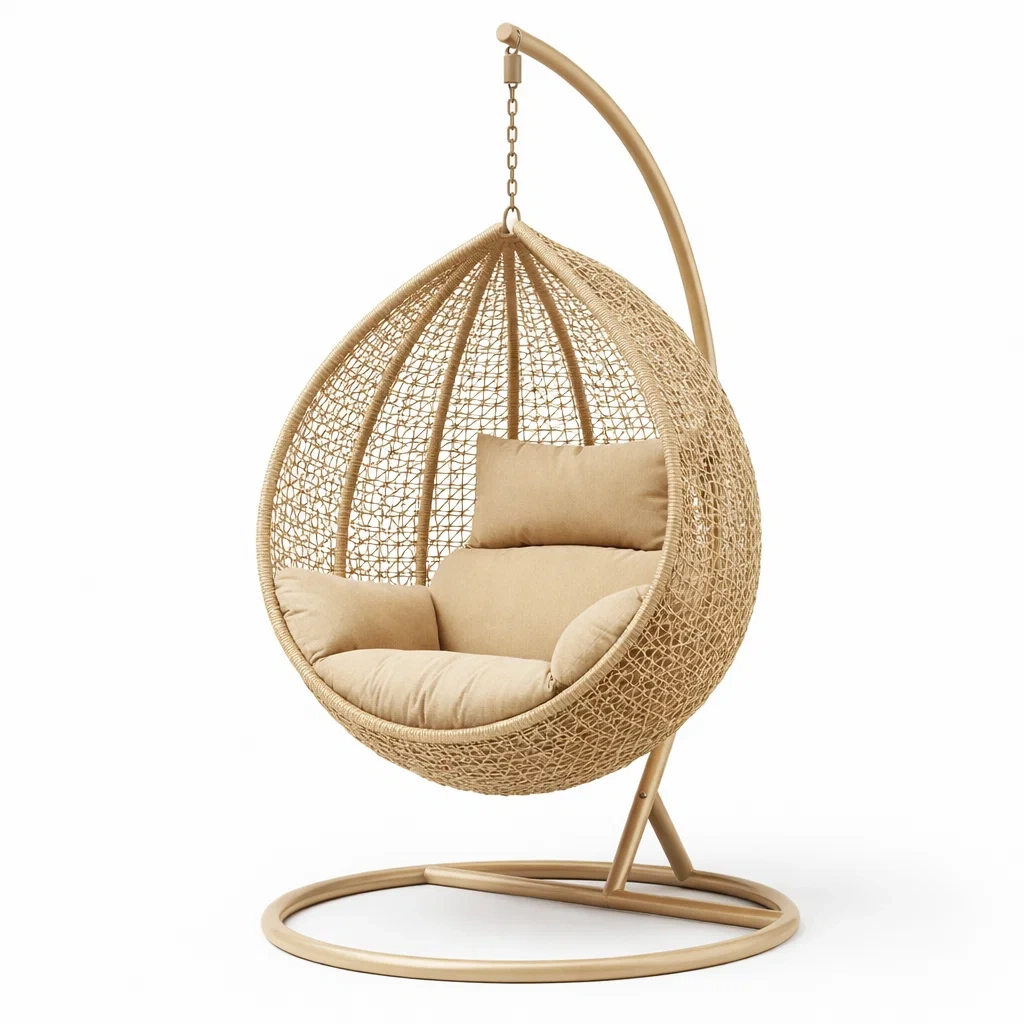 Fauteuil œuf suspendu en rotin avec structure en acier et coussin beige