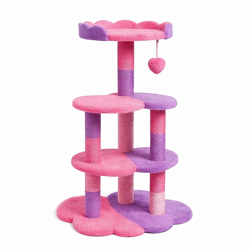 Arbre à chat à trois niveaux adapté aux chats. Chaque plateforme est recouverte de tissu pelucheux et les poteaux sont en sisal pour le griffage.