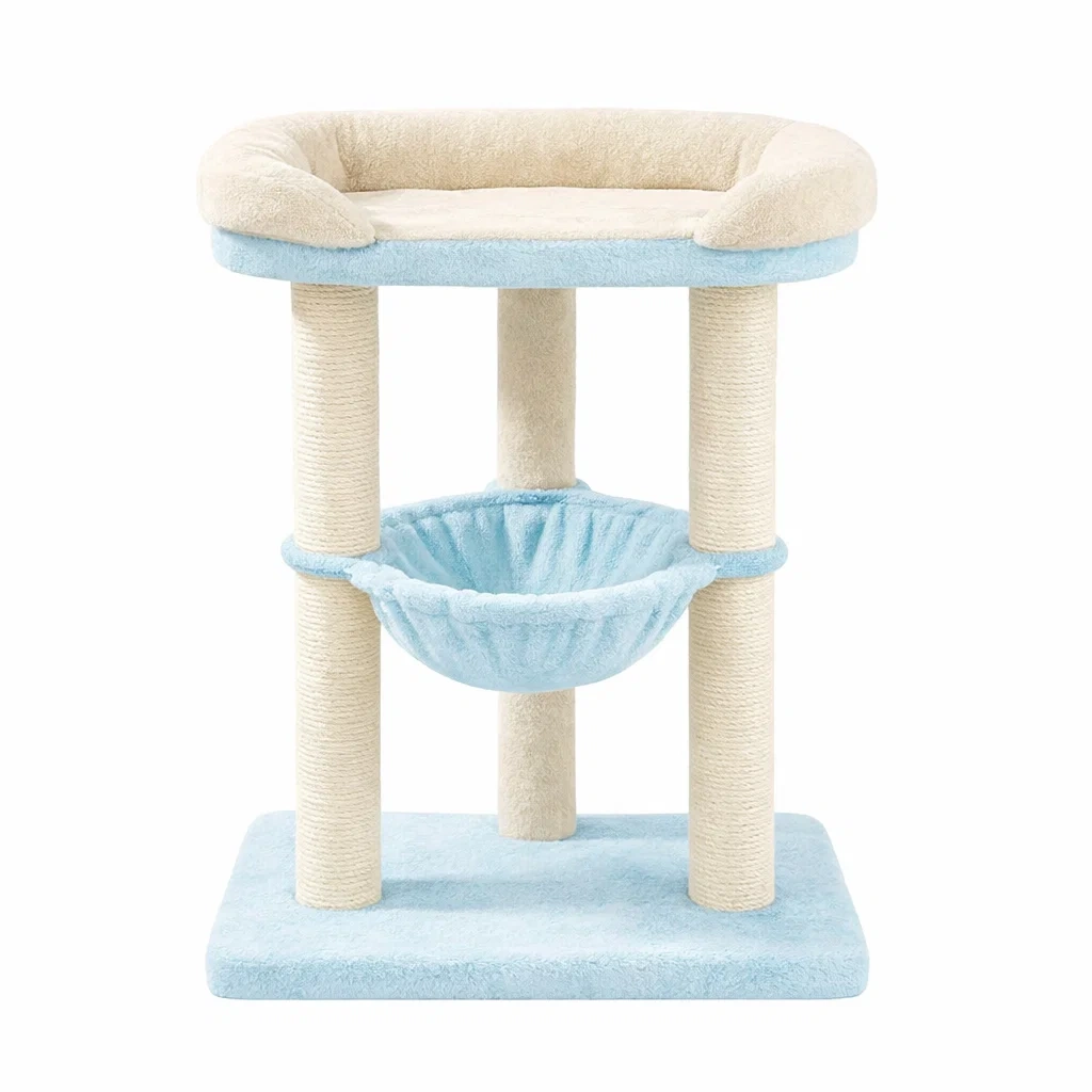 Matériau : Structure en bois, poteaux en sisal, plateforme et hamac en tissu peluche