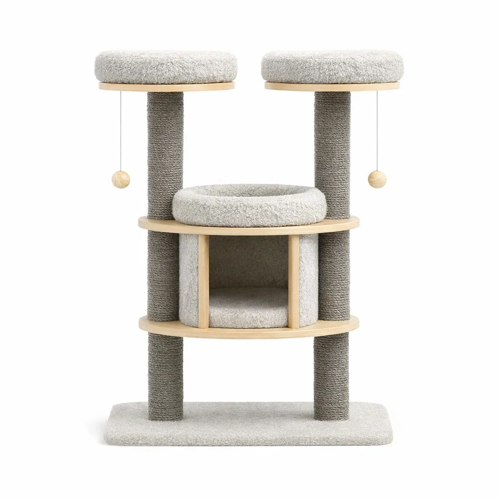 Matériau : Base en panneau de fibres de bois, tissu peluche gris clair, cordage en sisal pour griffoirs.
