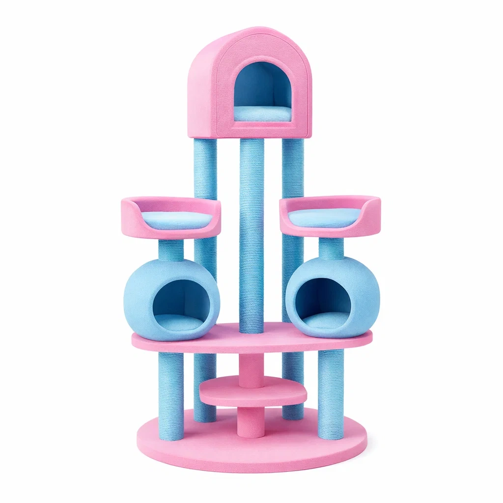 L'arbre à chat offre un espace d'amusement et de repos pour les chats, composé de tubes en carton renforcé recouverts de tissu en polyester et de sisal pour les griffoirs.