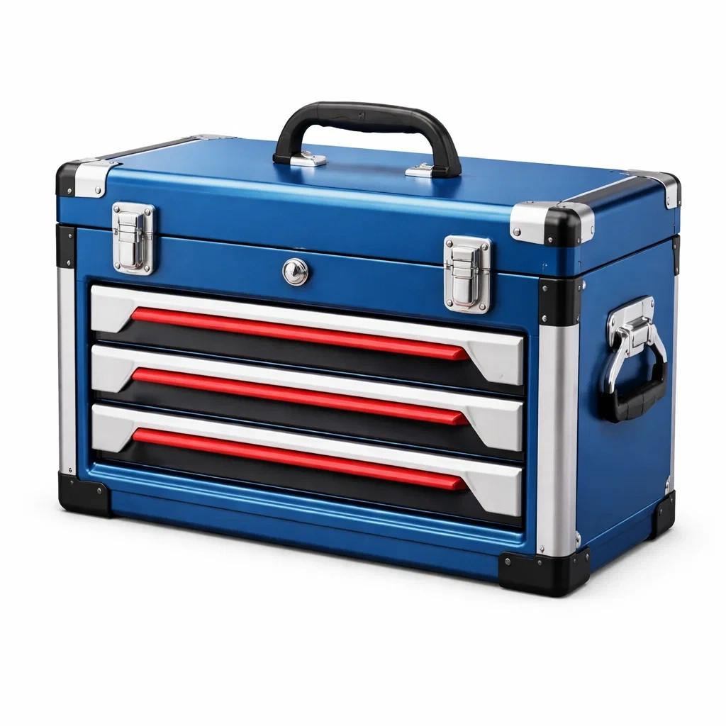 Ce coffre à outils est fabriqué en métal résistant avec une finition bleu et rouge. Il dispose de trois tiroirs pour organiser vos outils.