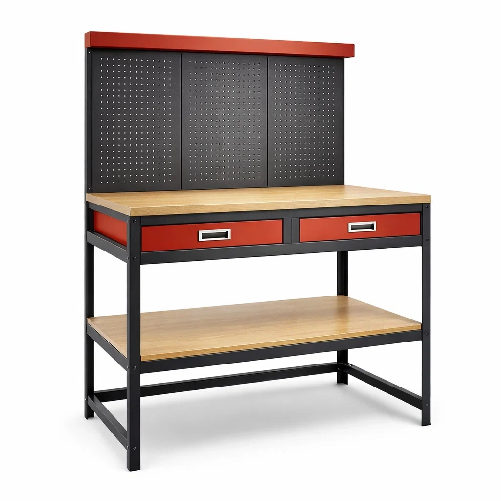 Établi de travail avec un cadre en acier et un plateau en panneau MDF. Le panneau perforé en acier permet d'organiser les outils facilement. Cet établi comprend deux tiroirs de rangement et une étagère fixe en dessous pour un espace de rangement supplémentaire.