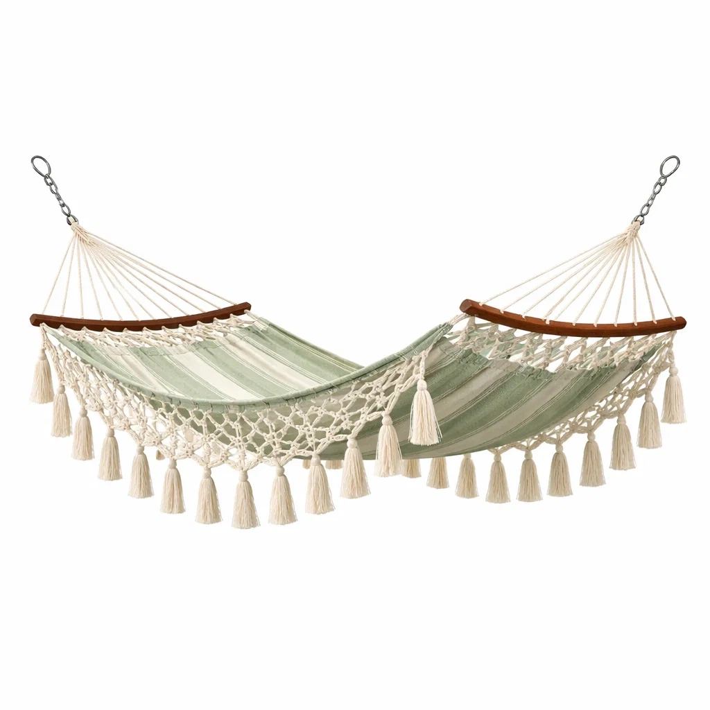 Hamac de 200 cm de longueur et 150 cm de largeur, fabriqué en coton. Les extrémités sont renforcées avec du bois, tandis que les franges sont en corde. Sa couleur rayée verte et blanche convient à un usage extérieur.