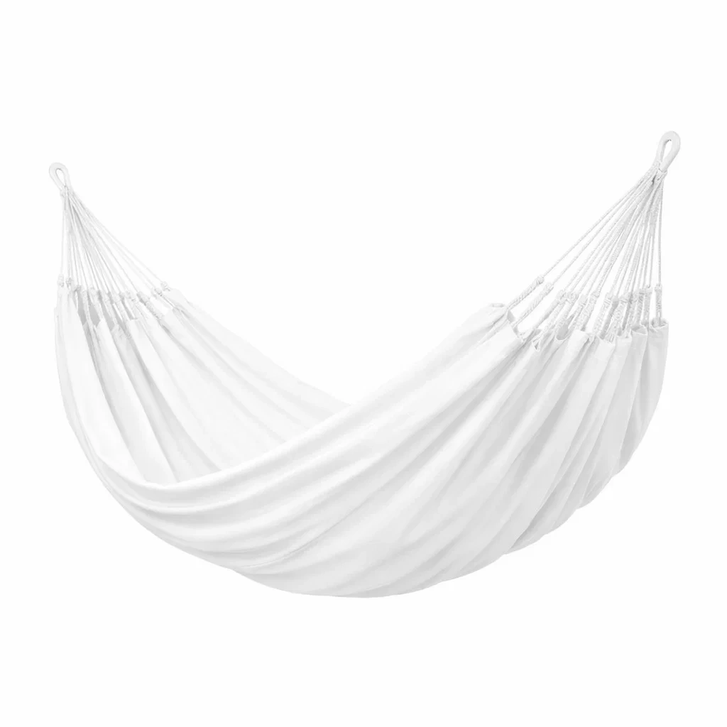 Ce hamac est fabriqué en tissu de coton, offrant une texture douce et résistante. Ses dimensions sont de 200 cm x 150 cm et il peut supporter un poids maximum de 200 kg.