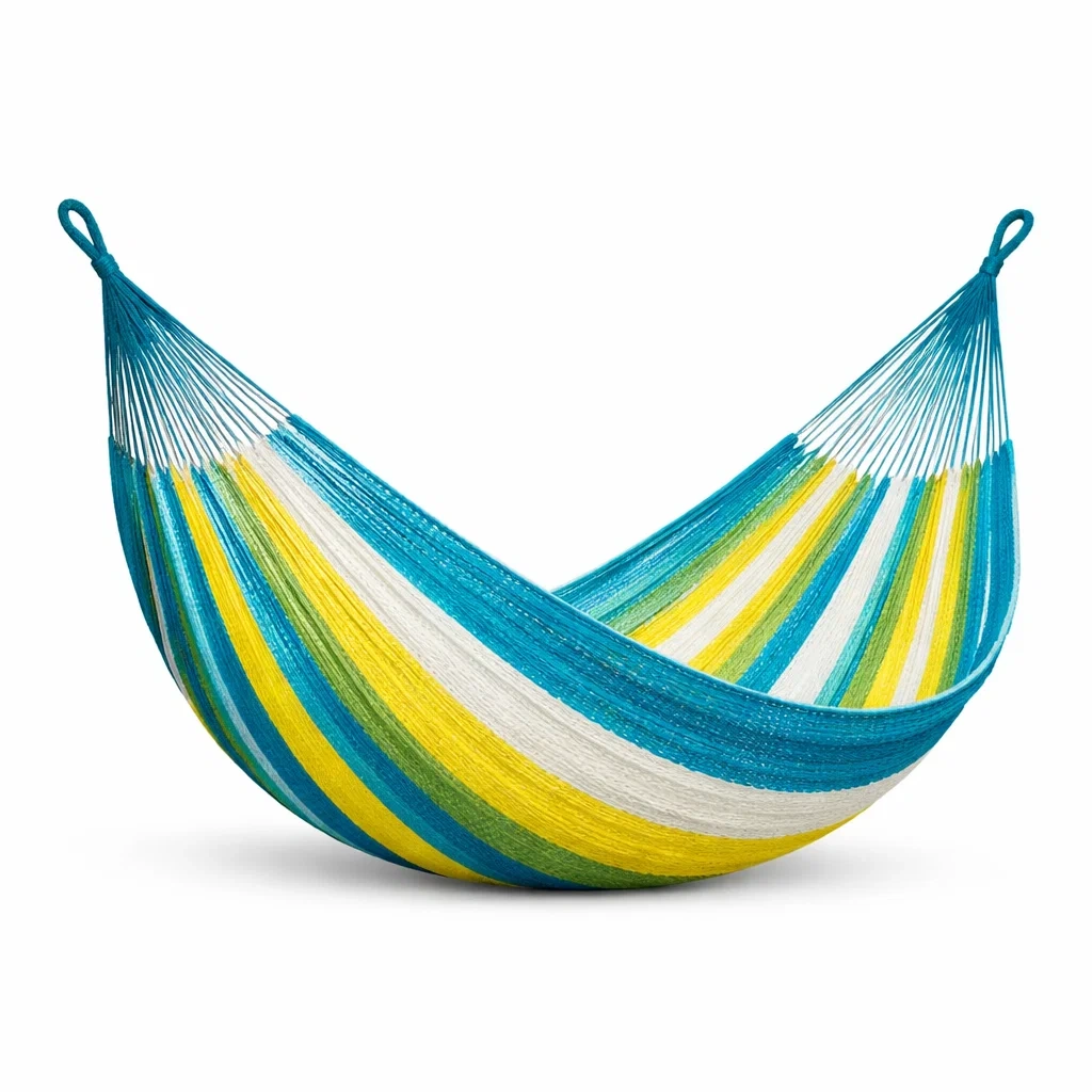 Ce hamac est fabriqué en coton multicolore avec des fils bleu, jaune, vert et blanc.